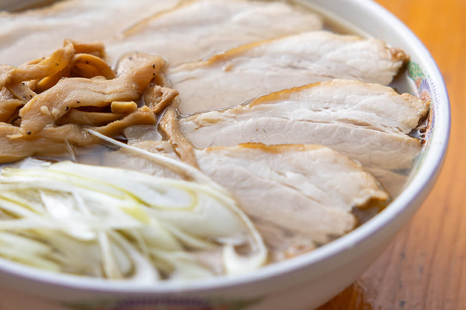 バラ肉をスープと一緒にじっくり煮込み、特製醤油につけ込む。「ちゃーしゅーめん」にはこのチャーシューの他、脂身の少ない肩ロースのチャーシューものる。