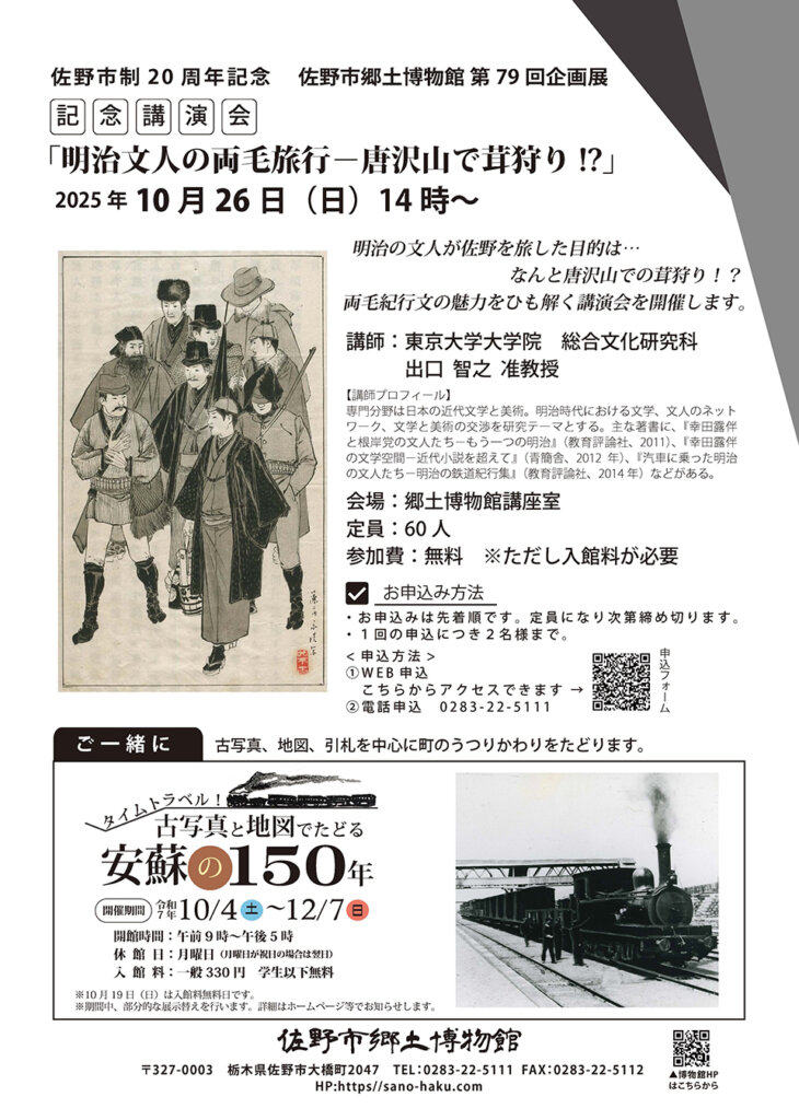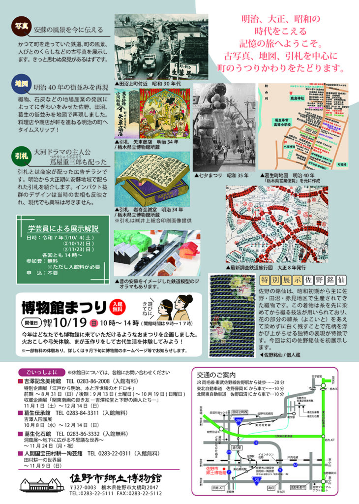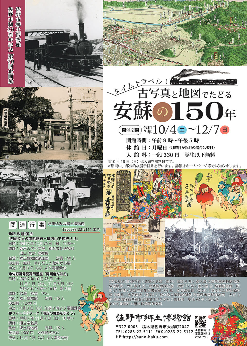 佐野市郷土博物館では、第79回企画展「タイムトラベル!古写真と地図でたどる安蘇の150年」が開催される。この企画展は佐野市制20周年を記念したものとなっている。現在の佐野市に広がる安蘇地域の古写真や地図、そして引札(ひきふだ)などが展示される。史料によっては限られた日数の展示となる。