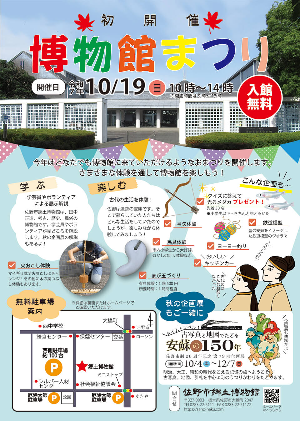 佐野市郷土博物館で、「博物館まつり」が初開催される。「楽しく学べ、体験できる」をテーマに、火起こしやまが玉作り体験のほか、民具体験や弓矢体験などが企画されている。その他にも、キッチンカーの出店もあり、家族で楽しめるイベントだ。
