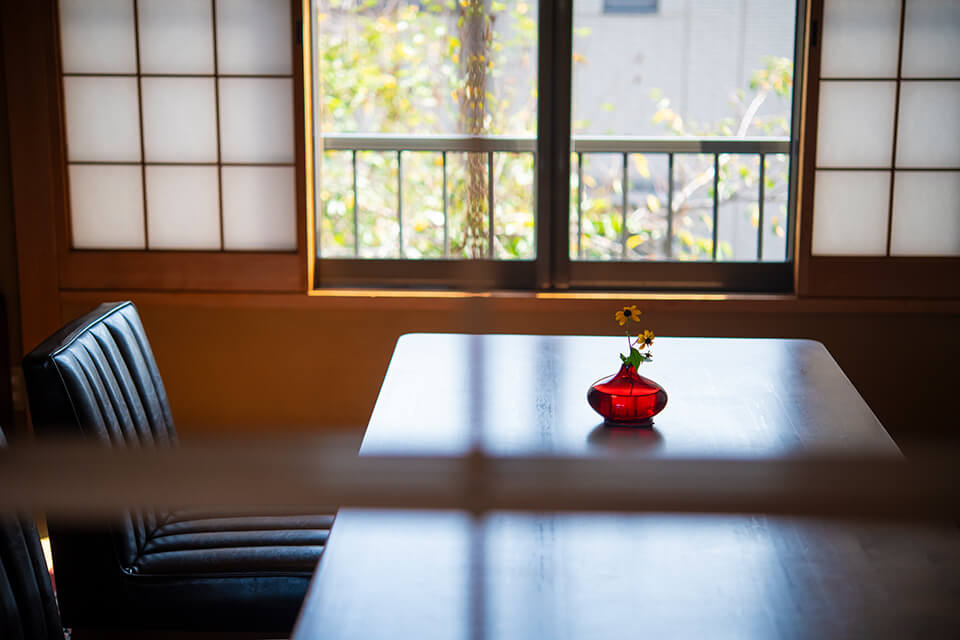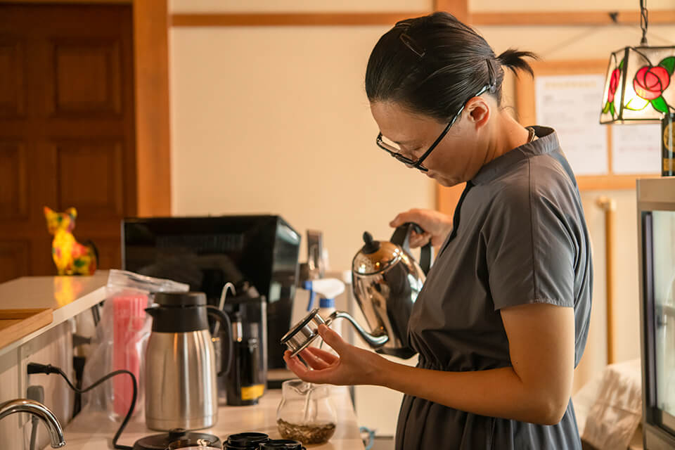 自宅を改装してつくられたという店内は、靴を脱いで2階にあがる隠れ家的スタイル。「靴を脱ぐという感覚はふつうのカフェや喫茶店などではあまりないことだと思うので、友だちの家に来た感覚でくつろいでもらえればうれしいです」と語るのは、店主の田名網映子さん。