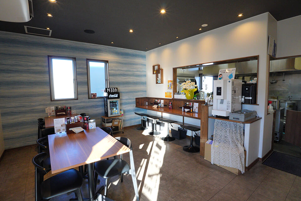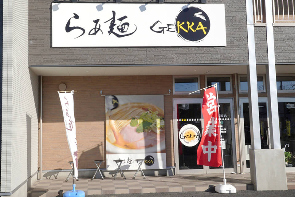 佐野新都市イオンモールから車で5分に位置にある『らあ麺 GEKKA』 。店内は落ち着いた雰囲気でゆっくりと食事を楽しむことができる。