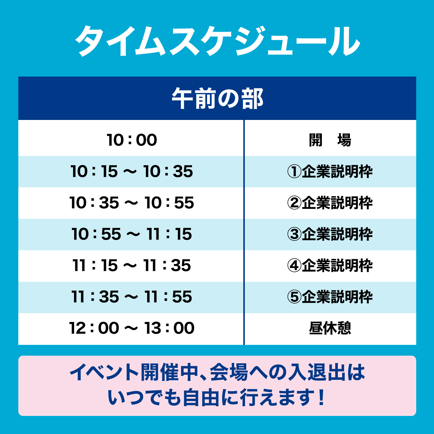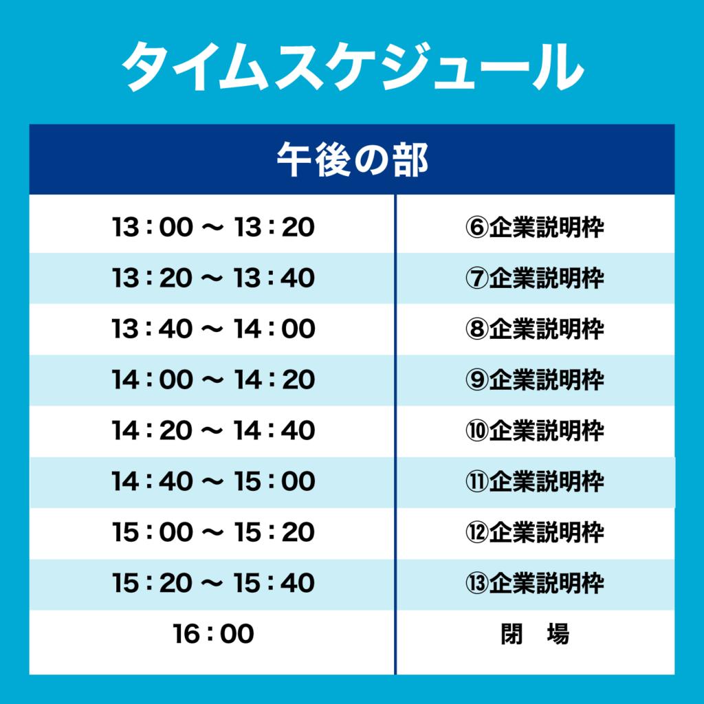 10時から16時の間、各ブースにて説明会が行われるが、会場への出入りは自由なので、好きな時間に参加することができる。
